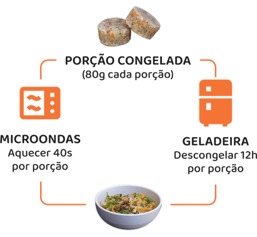 Descongelamento refrigerado: As porções a serem consumida devem podem ser colocadas em um recipiente com tampa para descongelamento refrigerado por até 12 horas e, posteriormente, aquecidas brevemente no micro-ondas ou em banho-maria para serem servidas ao cão em temperatura ambiente