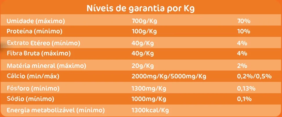 Vitamina A (mínimo) 5.000 UI, vitamina E (mínimo) 25 UI , vitamina D3 (mínimo) 600 UI, vitamina K3 (mínimo) 0,5 mg, vitamina B1 (mínimo) 1,2 mg, vitamina B2 (mínimo) 2,2 mg, vitamina B6 (mínimo) 1 mg, vitamina B12 (mínimo) 16 mcg, niacina (mínimo) 12,5 mg, biotina (mínimo) 0,03 mg, ácido fólico (mínimo) 0,2 mg, ácido pantotênico (mínimo) 7,5 mg, ferro (mínimo) 40 mg, cobre (mínimo) 3 mg, zinco (mínimo) 50 mg, manganês (mínimo) 2,5 mg, selênio (mínimo) 0,1 mg, iodo (mínimo) 0,8 mg, colina (mínimo) 1600 mg.